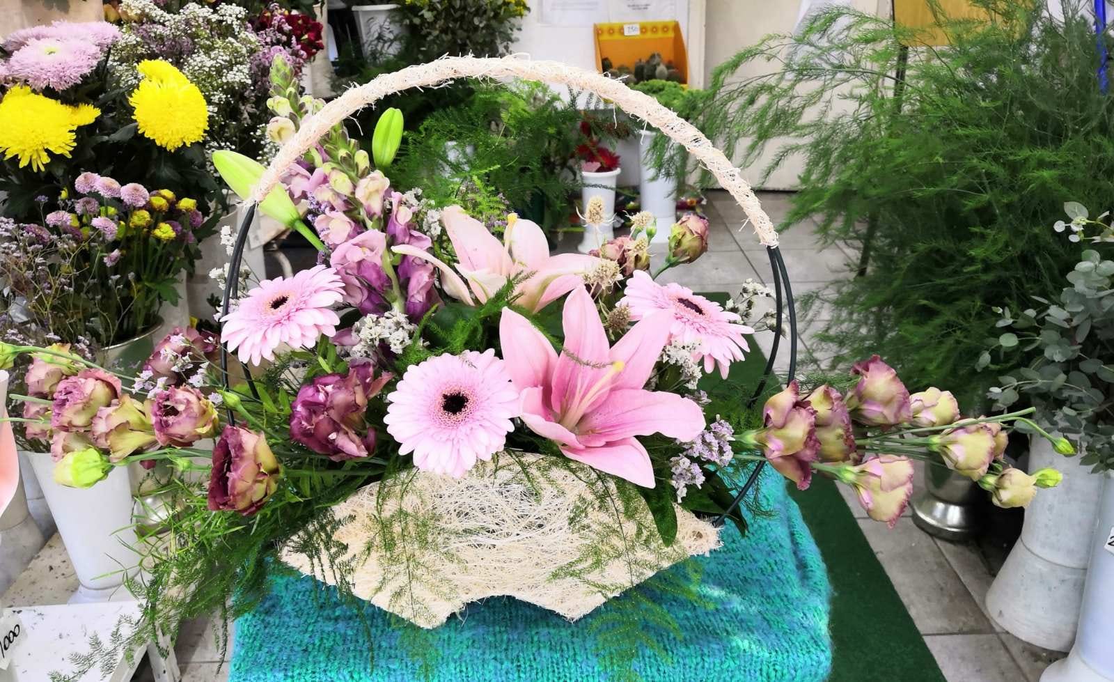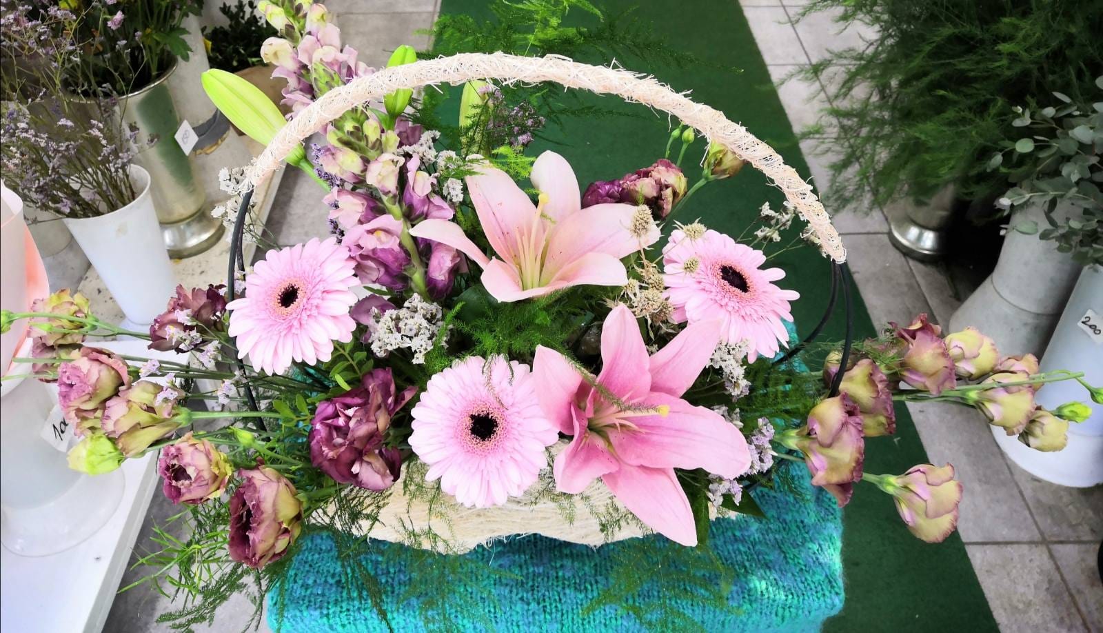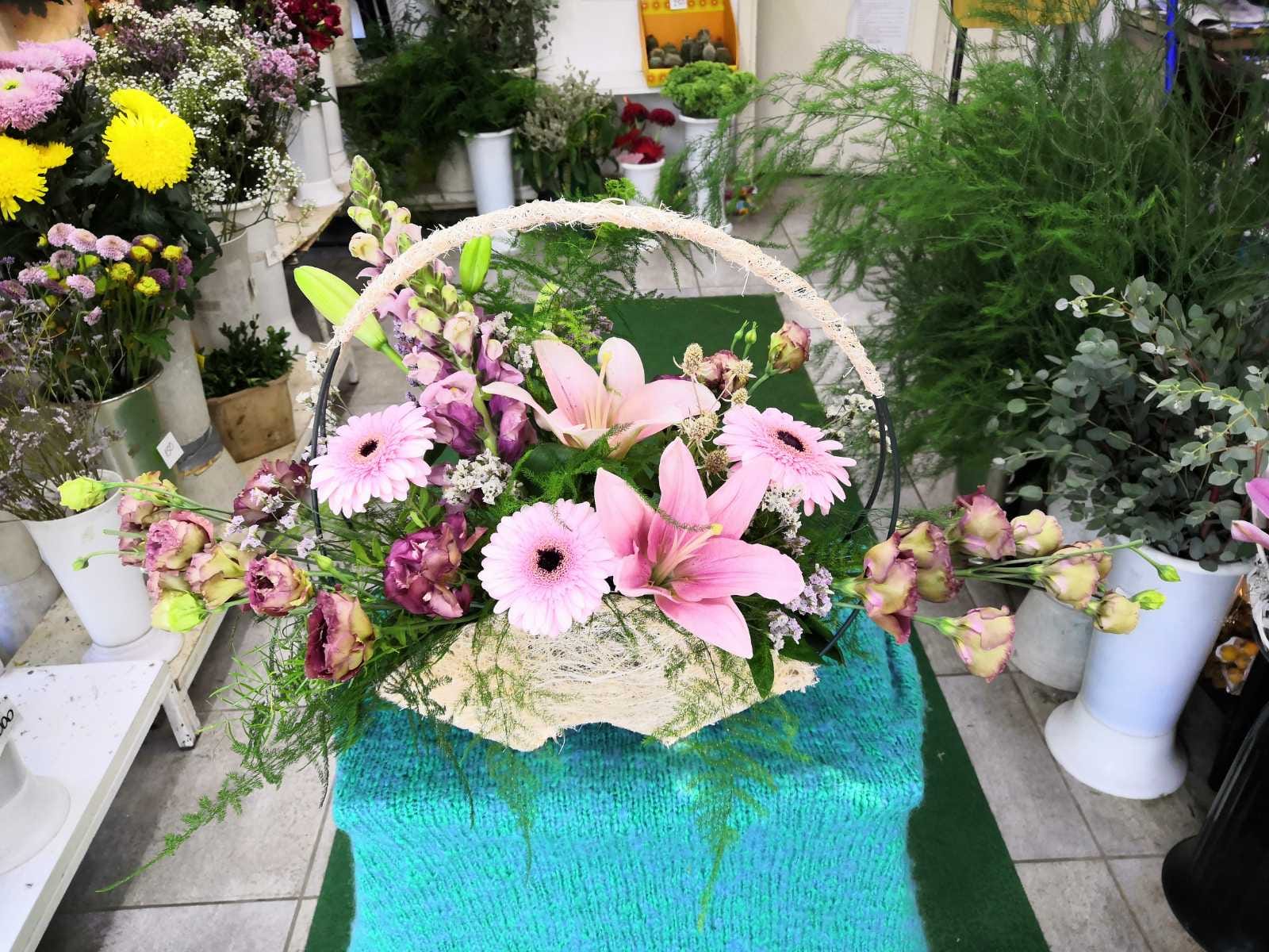 Aranžman je izrađen u jako lepoj dekor korpi od pletenog pruća, sa mix roze cvećem.